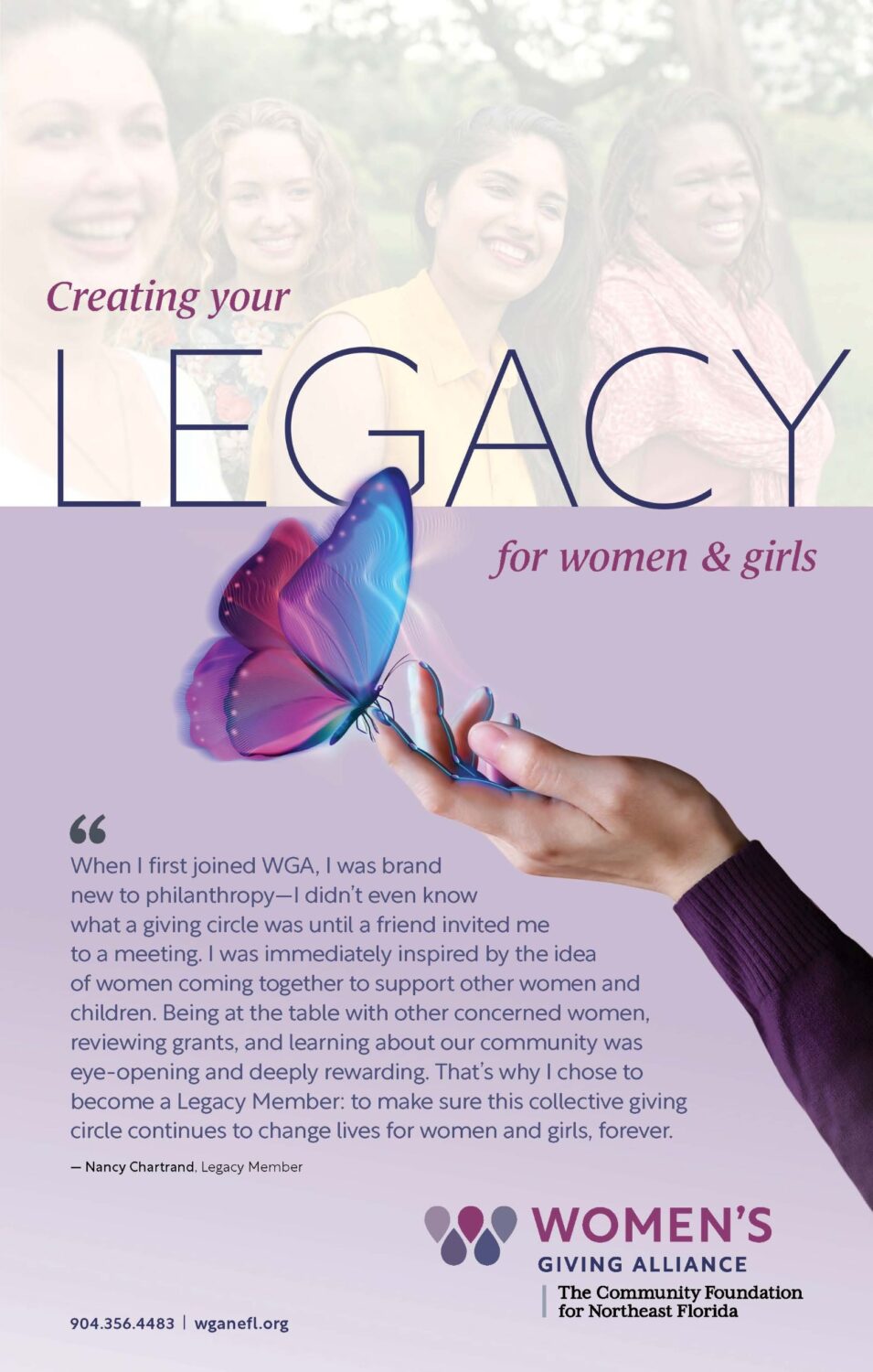 Legacy members need not make any future annual gifts to WGA, but they retain the full benefits of membership for as long as they live, and their endowed investment ensures that WGA’s philanthropic work will continue for women and girls in northeast Florida for generations to come.
